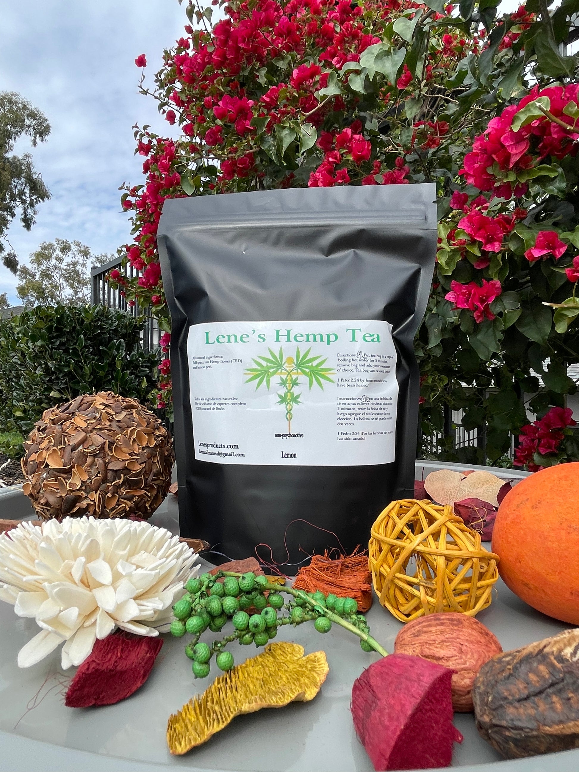 Tea bags filled with lemon peel or orange peel and medical grade hemp flower. 25 prefilled tea bags per pack.